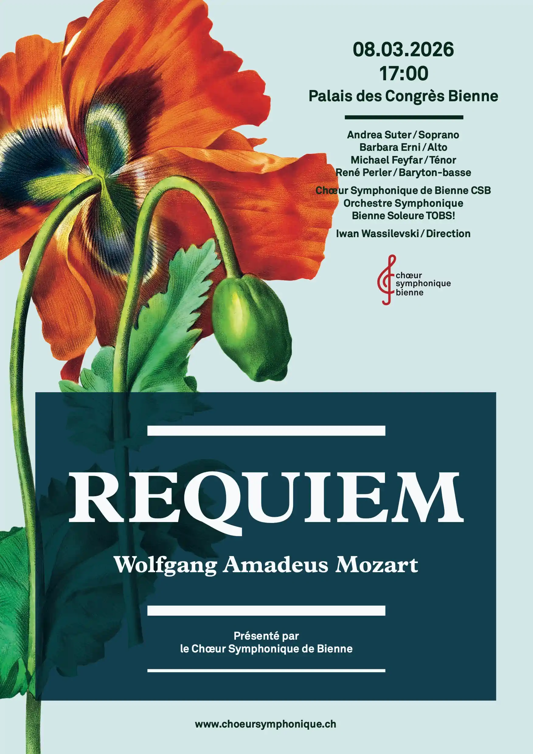 Samedi6 mars 2010, 20hDimanche7 mars 2010, 17hTemple Allemand Biel/BienneMuriel Schwarz sopranoNina Amon altoRaphaël Favre ténorMarc-Olivier Œtterli basse François Pantillon direction